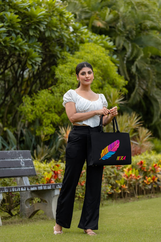 "Nixa Bloom Embroidered Colorful Feather Tote"
